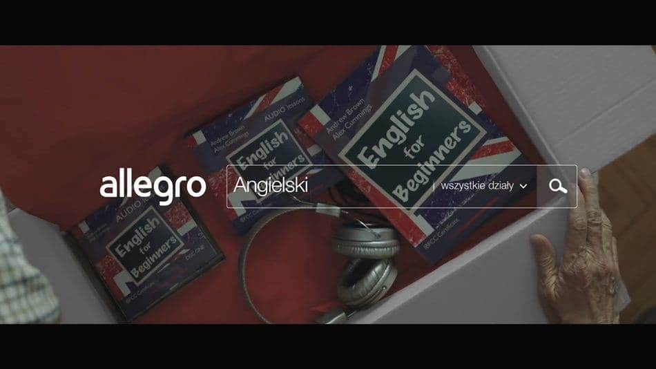 - 광고의 첫 장면은 allegro에서 "Angielski (영어)" 검색하는 것으로 시작합니다.