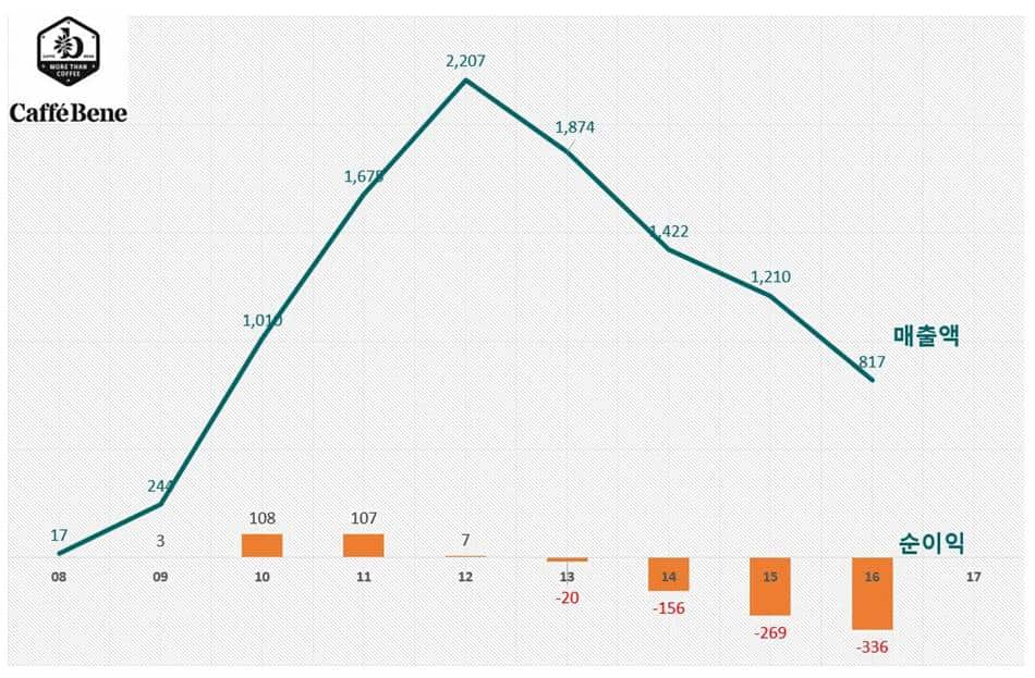 ▽ 카페베네 매출 및 손익 추이, 출처 – 유통산업 DB, 금융감독원 및 제 언론 기사