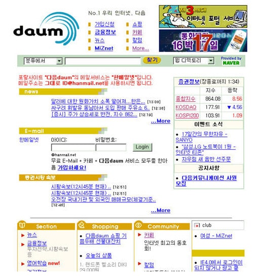 ▽ 1999년 처음 포털 서비스 개시 당시 다음 메인 화면,