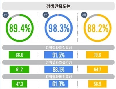 - 검색 결과의 적합성에 대해서 구글은 91.5% 만족도를 보였지만 다음은 70.6% 그리고 네이버는 다음보다도 낮은 66%를 보였다.
