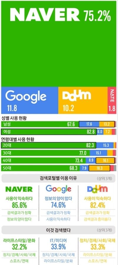 오픈 서베이 조사 결과에 따르면 네이버가 75.2%로 발군의 1위를 달리고 있고 구글 11.8%, 다음이 10.2%로 2, 3위를 차지하고 있다.