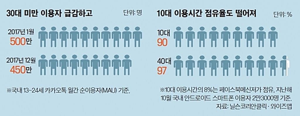 연령대별로 살펴보면 카톡은 젊은층에서 사용자 이탈이 발생하고 있다. 30대 미만의 카톡 이용자 수는 750만명으로 2017년 1월에 비해서 10% 하락했는데 이는 특히 13~24세에서는 500만명에서 450만명으로 감소가 큰 영향을 미침.