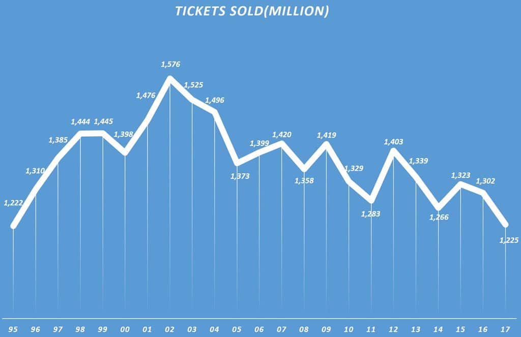 아무튼 영화 티켓 판매수로 살펴본 미국의 동향은 확실히 2002년을 정점으로 하락 추세를 보이고 있습니다. 연도별로 뛰어난 영화가 등장하면 증가하는 경우도 있지만 추세적으로 하락하는 모습이 그래프에서 그대로 보여집니다.