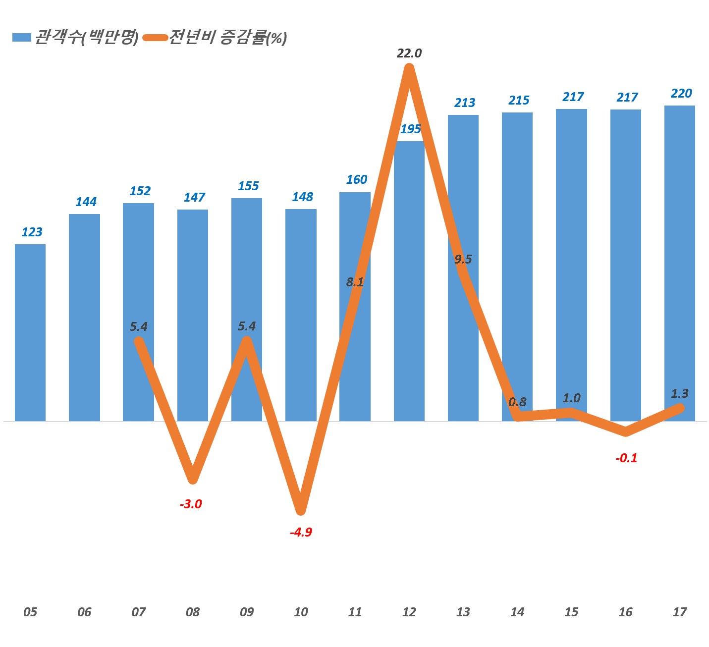 이러한 미국 트렌드와 견주어 한국 영화 관객수 증가 추이는 어떻까요? 아직 끝나지 않은 2018년은 제외하고 2017년까지 영화 관람객 추이를 살펴보겠습니다.