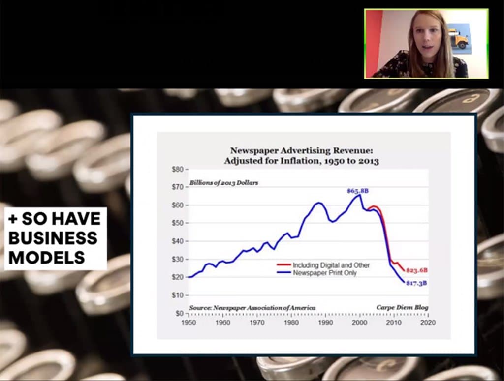 “우리가 가장 먼저 알아챈 것은 소비자 습관이 극적으로 변화했다는 것입니다. 미국에서 신문을 읽는 성인의 비율은 2007년의 48%에서 2016년에는 28%로 떨어졌습니다. 2007년에는 미국 성인의 16%만이 인터넷이 그들의 주요 뉴스 공급원이라고 말했지만 2016년에는 그 수치가 40%에 달했습니다. – 케이트 메이스너( Kate Meissner ), 악시오스