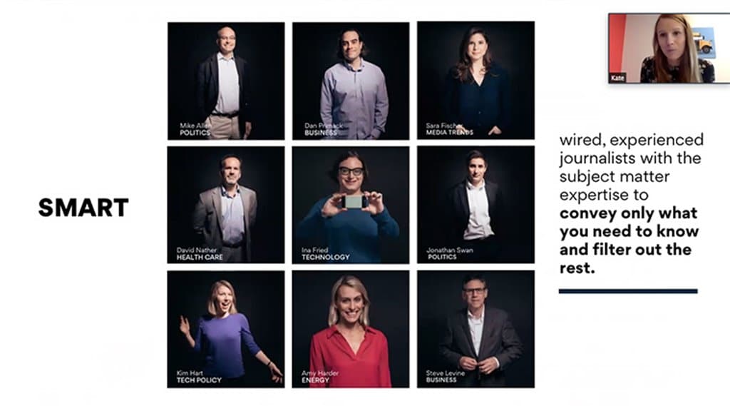“우리는 똑똑한 독자들이 의지할 수 있는 플랫폼을 만들기 위해 잡동사니를 잘라내야 했습니다. 우리가 발견한 것은 사람들이 믿을 수 있는 정보를 어디서 얻을 수 있는지 모르고 효율적으로 정보를 얻을 수 있는지에 대해 지속적으로 좌절감을 느낀다는 것입니다.”- 케이트 메이스너( Kate Meissner ), 악시오스