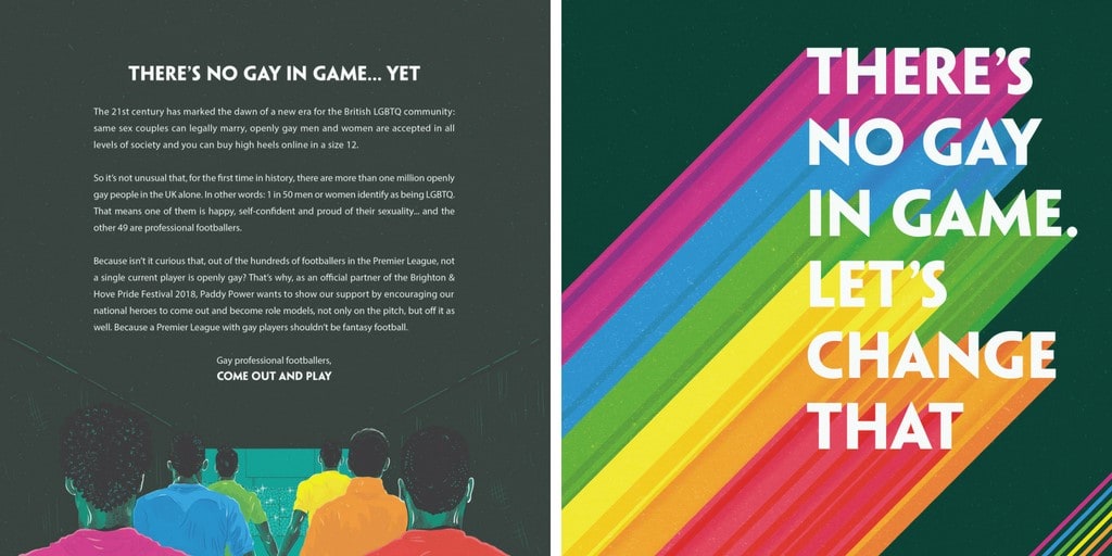 패디 파워(Paddy Power)는 500여명에 달하는 프리미어 리그 축구선수중 어느 누구도 공개적으로 게이임을 선언한 선수는 없었기에 이번 기회에 “게이 선수들에게 나서 나오라고 촉구하려는 목적”을가지고 LGBT를 지원했다고 밝혔습니다.