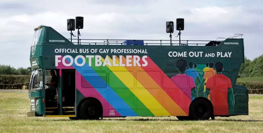 2018년 8월 도박회사인 패디 파워(Paddy Power)는 브라이튼 게이 프라이드 행진(Brighton’s Gay Pride march)에 “게이 프로축구선수들의 공식 버스”라고 칭하며 2층버스를 제공했습니다.