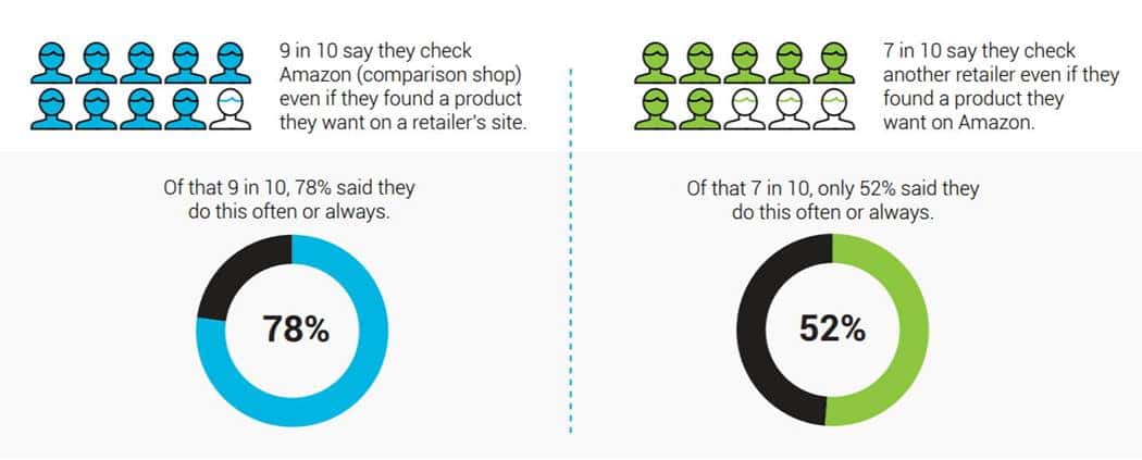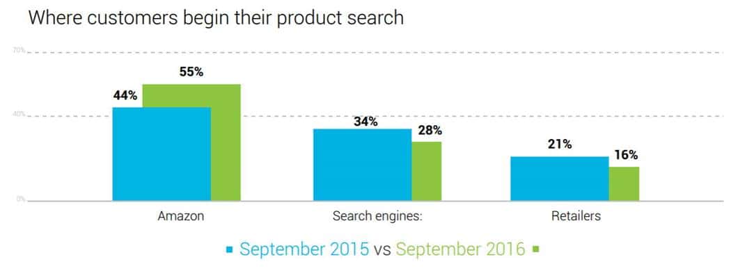 또 다른 조사로는 블룸버그 산하 시장조사업체 블룸리치가 2017년 2천명의 미국 온라인 판매자를 대상으로 조사한 결과에 따르면, 쇼핑 검색 時 55%가 구글보다 아마존 사이트에서 먼저 검색을 하는 것으로 조사됐으며 이 수치는 2015년보다 11% 증가한 것입니다.