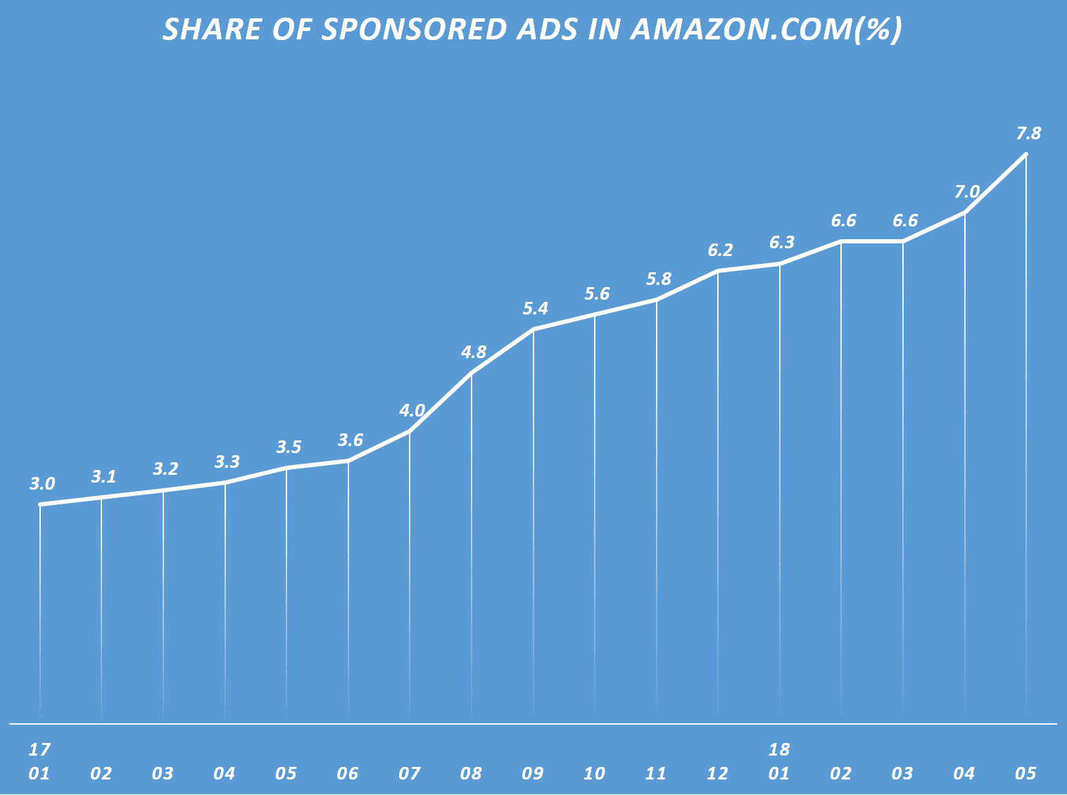 - 아마존 검색 결과 페이지에서 광고가 차지하는 비율은 20117년 1월 3%에서 2018년 5월 7.8%에 이르러 아주 빠른 속도로 증가