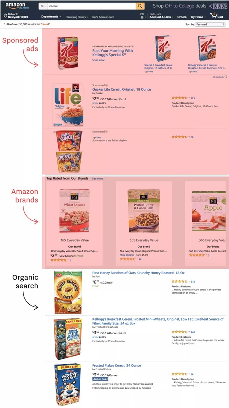 아마존에서 시리얼(cereal)을 검색 시 아마존은 스폰서 상품 > 아마존 자체 상품 > 일반 검색 상품으로 순으로 보여 줍니다.