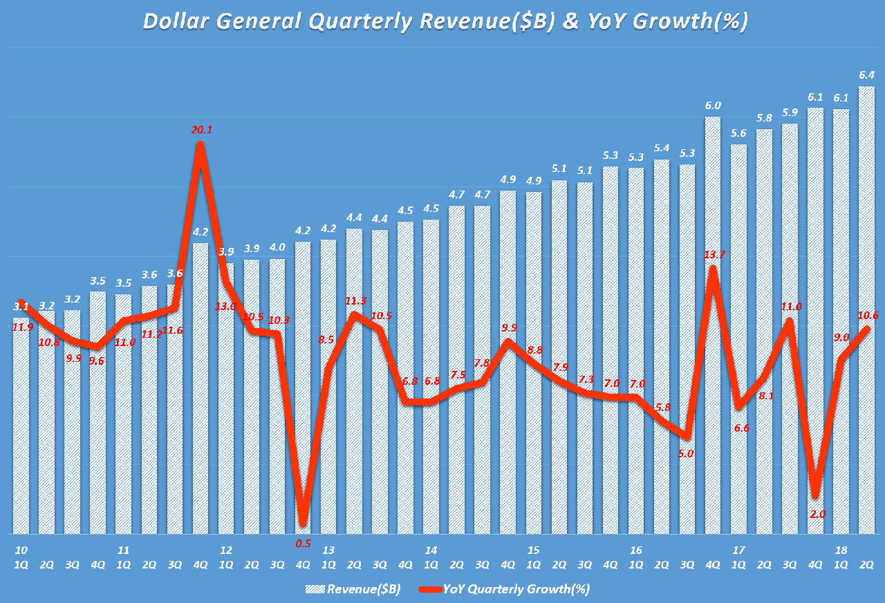 그렇기에 달러 제너널(Dollar General)은 최근 10%에 가까운 고성장을 이어가고 있습니다.   2018년 2분기엔 전년 동기 比 10.6% 성장했네요.