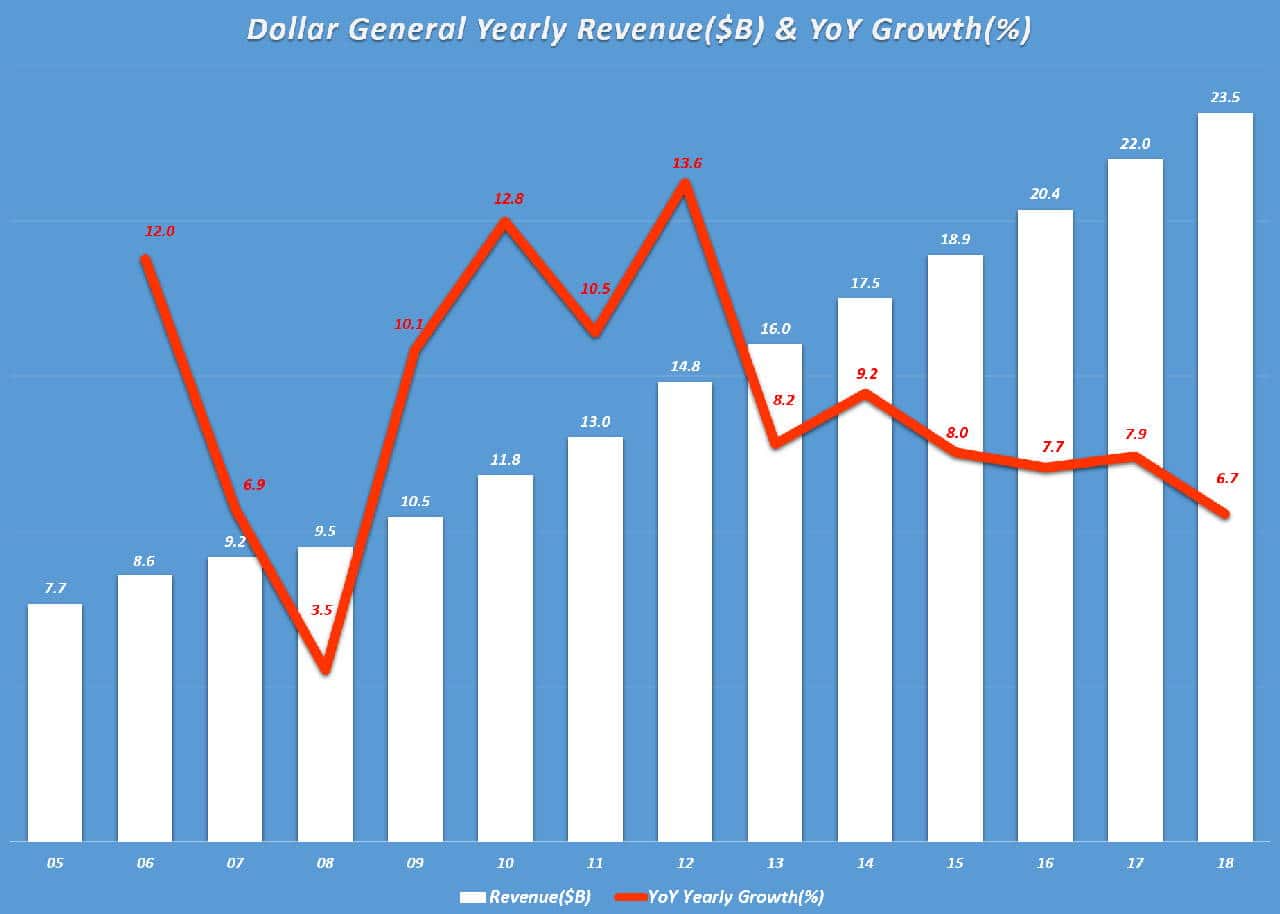 마국 소매유통 달러 제너럴 연도별 매출 및 전년 비 성장율(Dollar General Yearly Revenue($B) & YoY Growth(%), Graph by Happist
