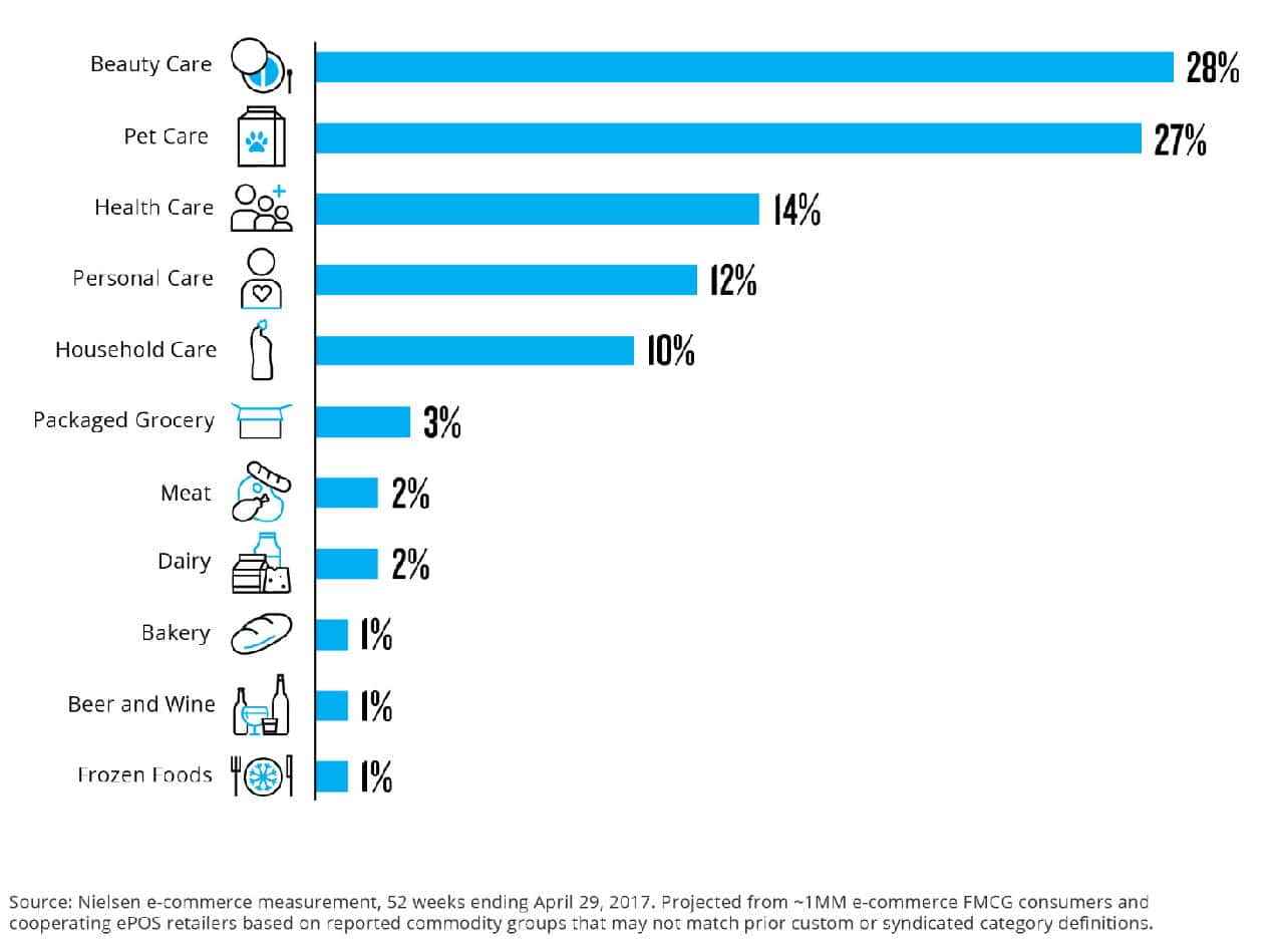 아래는 2017년 AC Nielsen에서 주요 제품 카케고리별 온라인 판매 비중을 조사한 자료입니다. 이에 따르면 Packaged grocery 3%, meat 2% 등으로 온라인 구입 비율이 매우 매우 낮습니다.