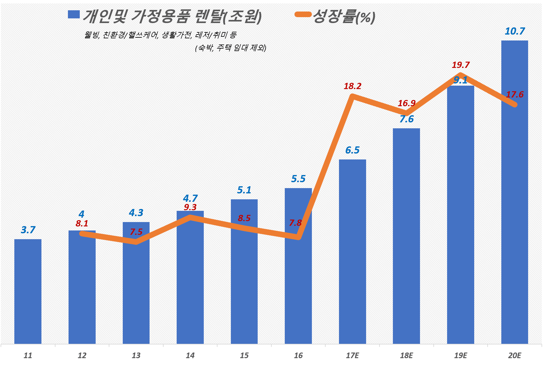 한국에서 개인 및 가정용품 렌탈 시장 규모는 일전에 소개한 [차트로 읽는 트렌드] 한국 렌탈 시장 규모 추이에서 소개했듯이 2017년을 기준으로 6.5조에 이르고 매년 20%가까이 성장하고 있는 시장이기도 하다.