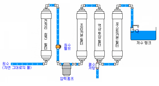 이 방식은 액체의 농도차이를 이용해 정수 능력이 뛰어나다는 장점이 있지만, 상대적으로 정수 속도가 느리기 때문에 물을 미리 모아두는 저수조가 필요하기 때문에 정수기 부피가 크고 가격도 비싸다는 단점이 있다.
