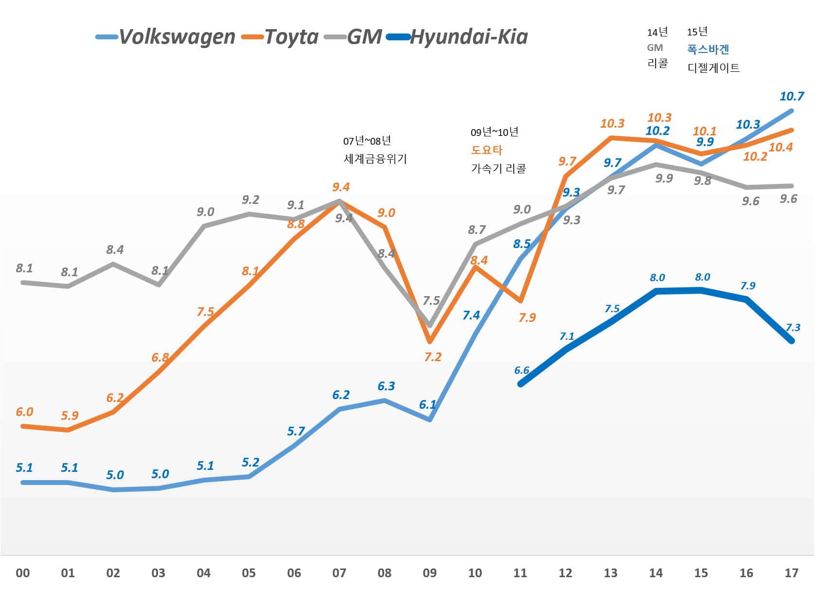 참고로 2017년까지 세계 4대 자동차  메이커의 연도별 판매량 추이를 살펴보면 아래와 같습니다.  폭스바겐이 디젤 스캔들에도 불구하고 1위를 질주하고 있으며, 도요타는 한때 1위에 올랐지만 2016년부터는 폭스바겐에 이어 2위롤 밀려났습니다.
