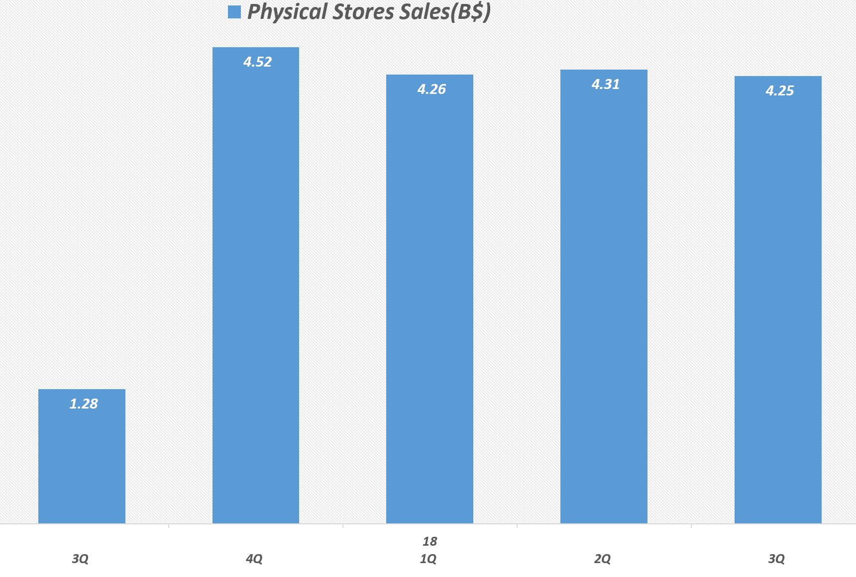 최근 발표된 아마존의 2018년 3분기 실적을 볼까요?  아마존 실적 중 오프라인 매장에서 일어난 매출 실적을 나타내는 Physical Stores Sales는 2017년  4분기이래 지속적으로 하락하는 모습을 보여주고 있습니다.