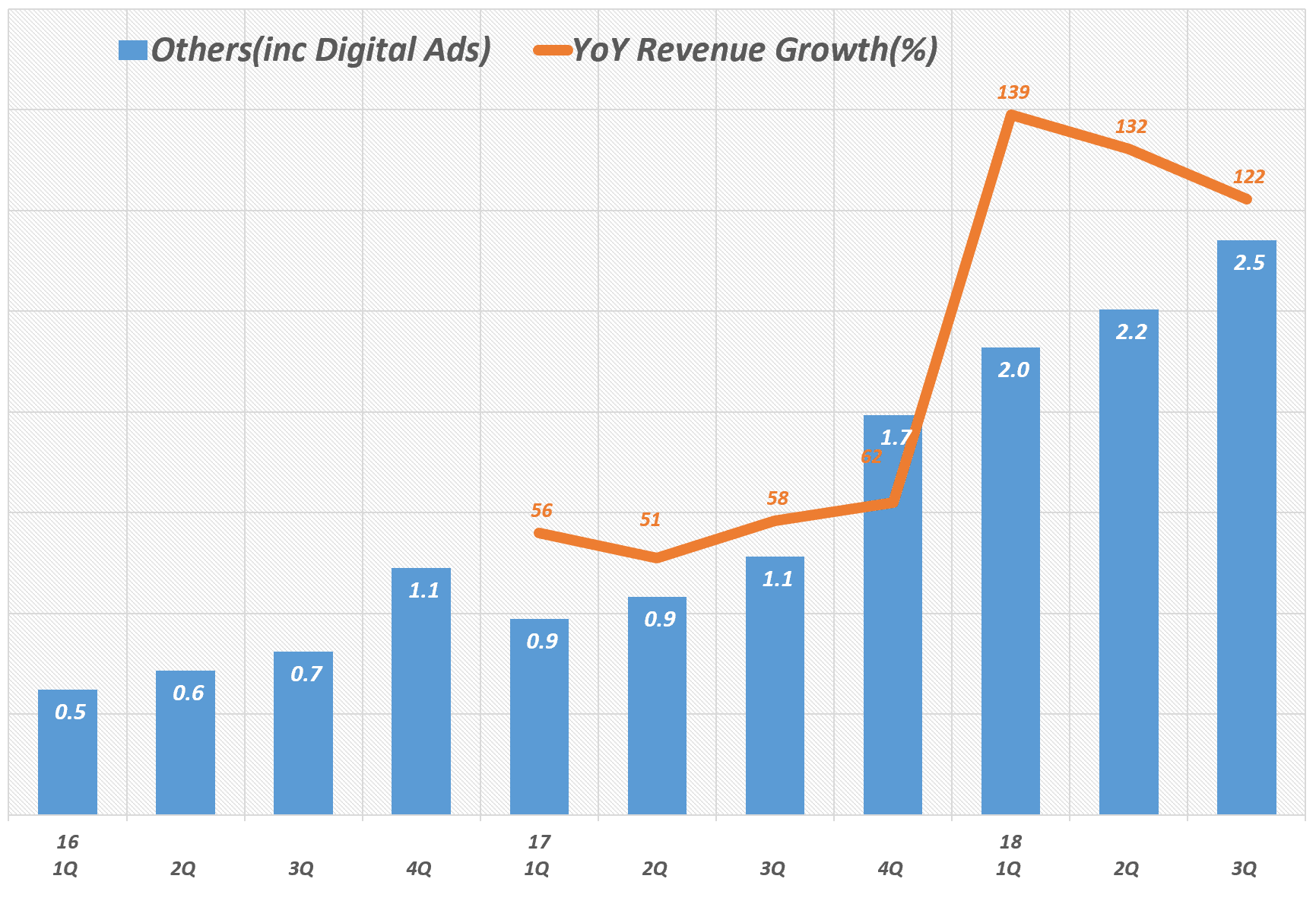 디지탈 광고가 주를 이루는 기타 부문 분기별 매출 추이(2016년 1분기 ~ 2018년 3분기) Amazon  digital ads, Graph by Happist