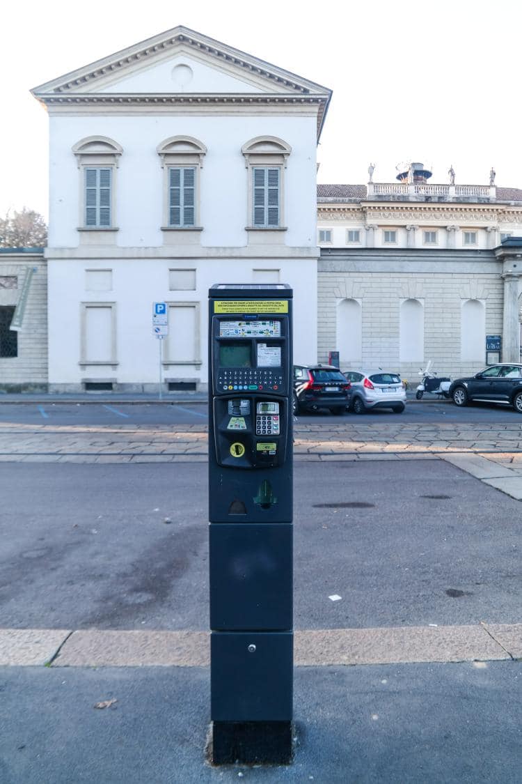 이탈리아 자동차 여행 – Indro Montanelli Park 건너편 Modern Art Gallery 정문 근처 의 거리주차장에 있는 주차 요금 머신, Image by Happist