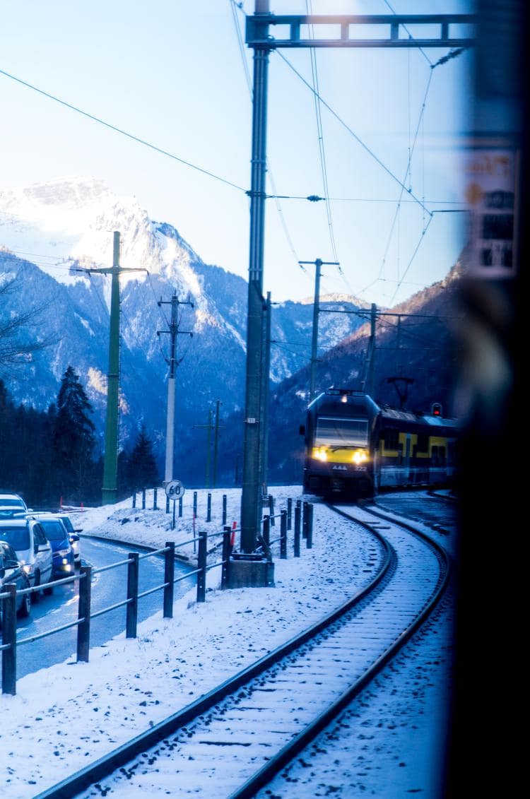 스위스 자동차 여행 – 그린델발트로 가는 열차에서 달려오는 도 다른 열차를 담아 보았다, Image by Happist