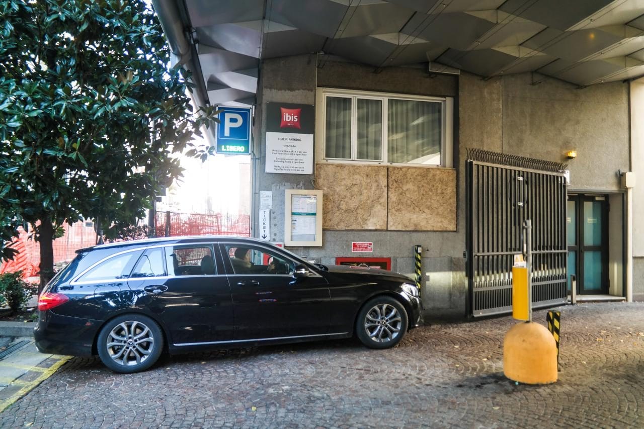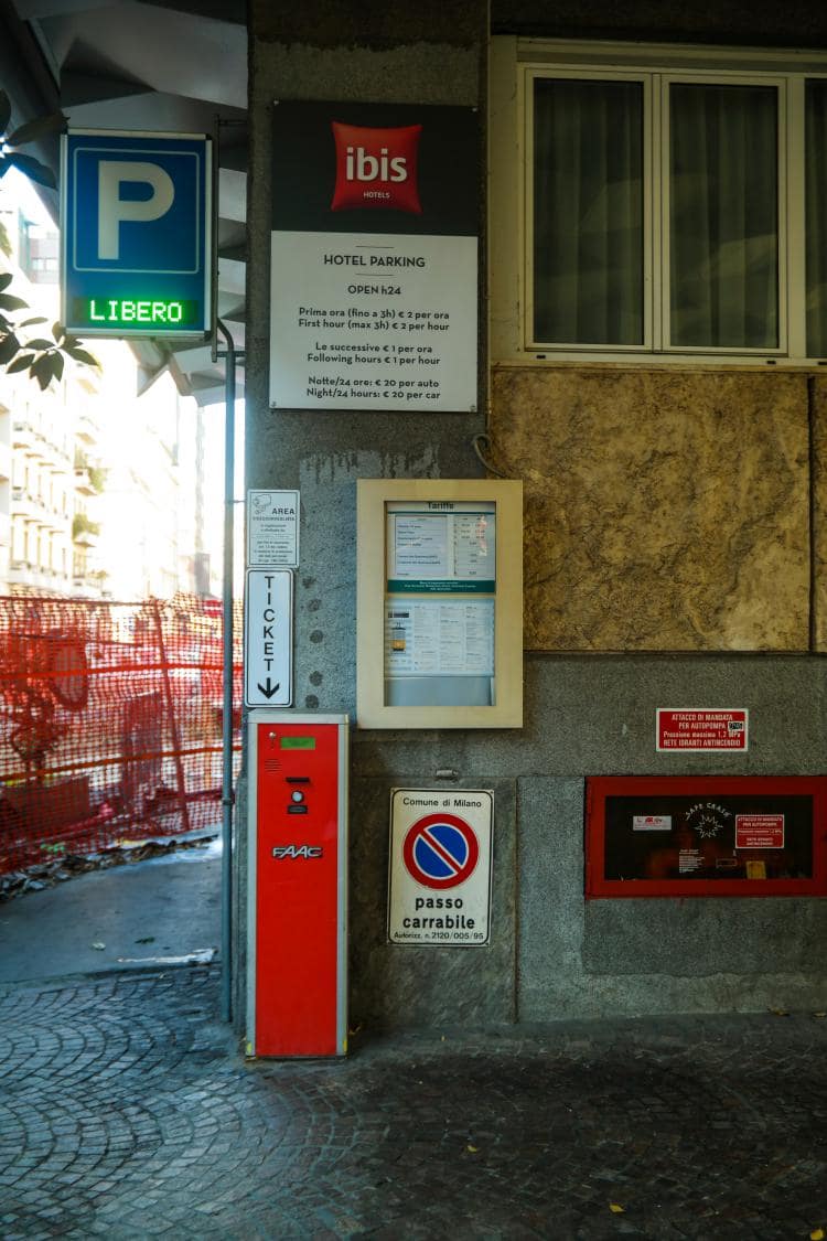 아무튼 셔틀버스가 자리를 비켜주니 주차장 간판과 티켓 머신등이 나타납니다. 아래 사진에서 보여주는 풍경이 바로 밀라노 IBIS Centro 호텔 주차장 입구입니다.