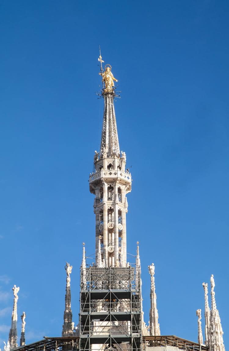 두오모 지붕 정상에 오르면 금색의 마리아상을 정면으로 볼 수 있습니다. 이를 배경으로 사진을 담으면 멋진 사진이 나옵니다.
