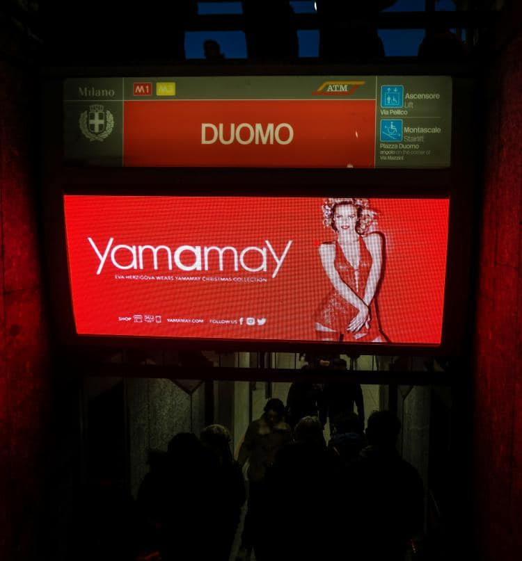 이탈리아 자동차 여행, 밀라노 두오모 메트로역 입구의 광고, Image by Happist