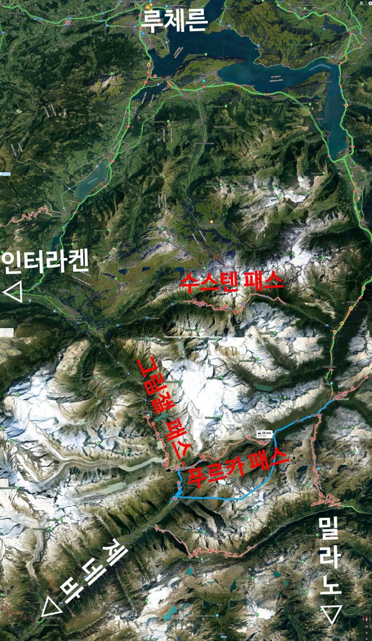루체른 인터라켄 이탈리아 밀라노 방향 주요 도로 방향 및 푸르카 패스, 그림젤 패스 그리고 수스텐 패스 위치도
