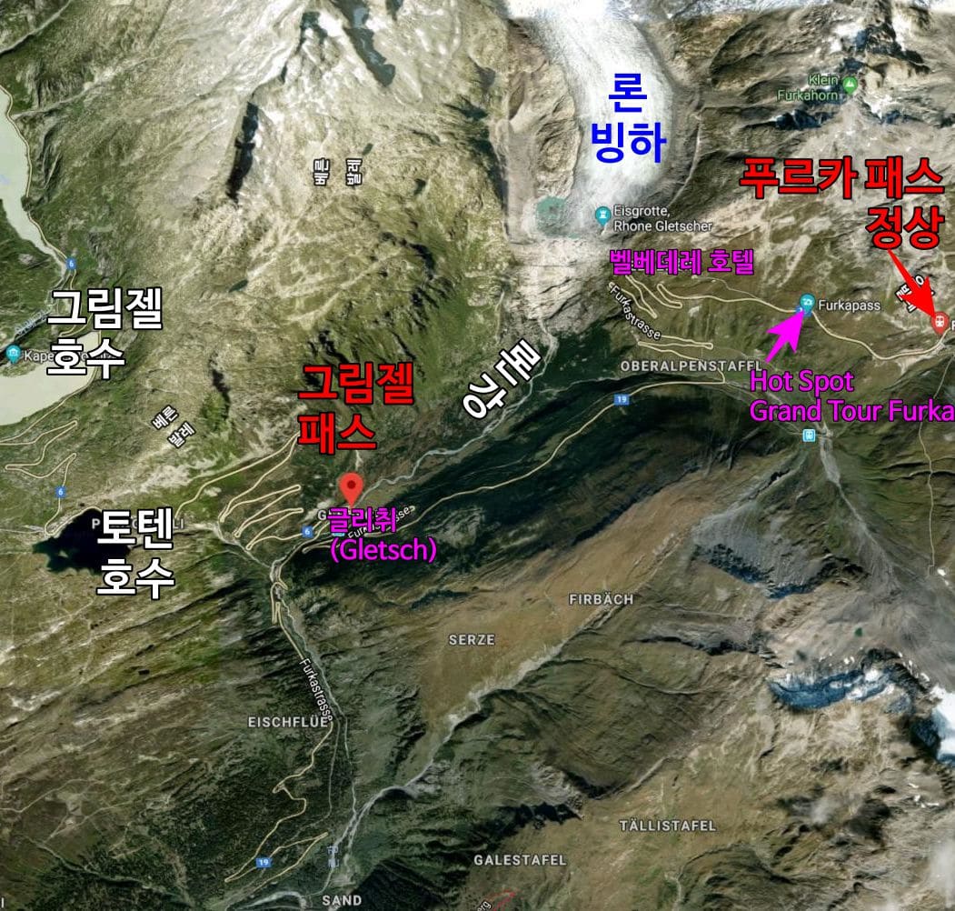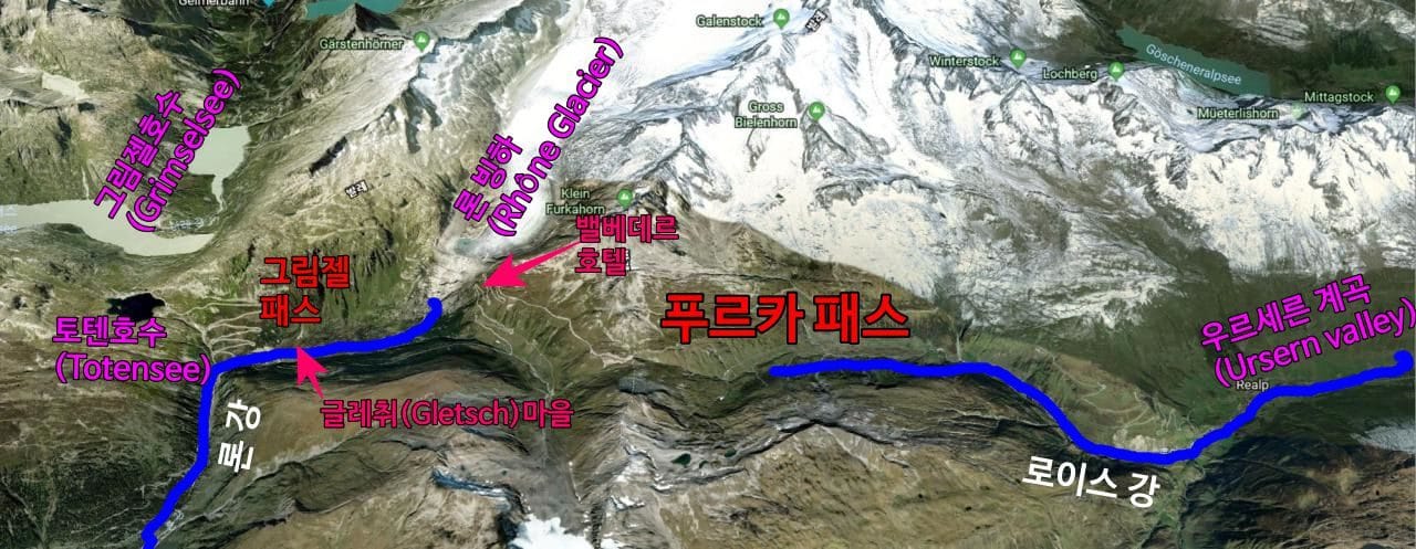 즉 이 푸르카 패스에서 베르너 오버란트(Bernese Oberland)가 분기하고 론강과 로이스강이 시작되는 지점이라고 할 수 있습니다. 상당히 지정학적으로 중요한 곳이라 할 수 있습니다.