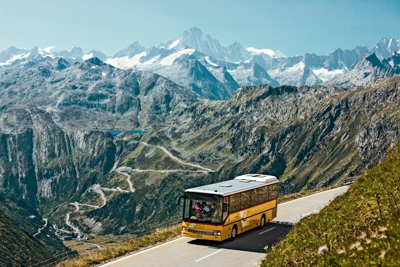 스위스 푸르카 패스를 지나는 포스트 버스(Post Bus), Furka Pass, Obergoms, Switzerland, Image – hpgruesen