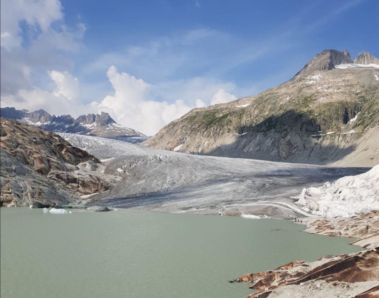 푸르카 패스 벨베데레(Belvédère) 마을위의 론 빙하와 빙하가 녹은 론 강물이 만들어진 모습, Image -veronika Schöpfer
