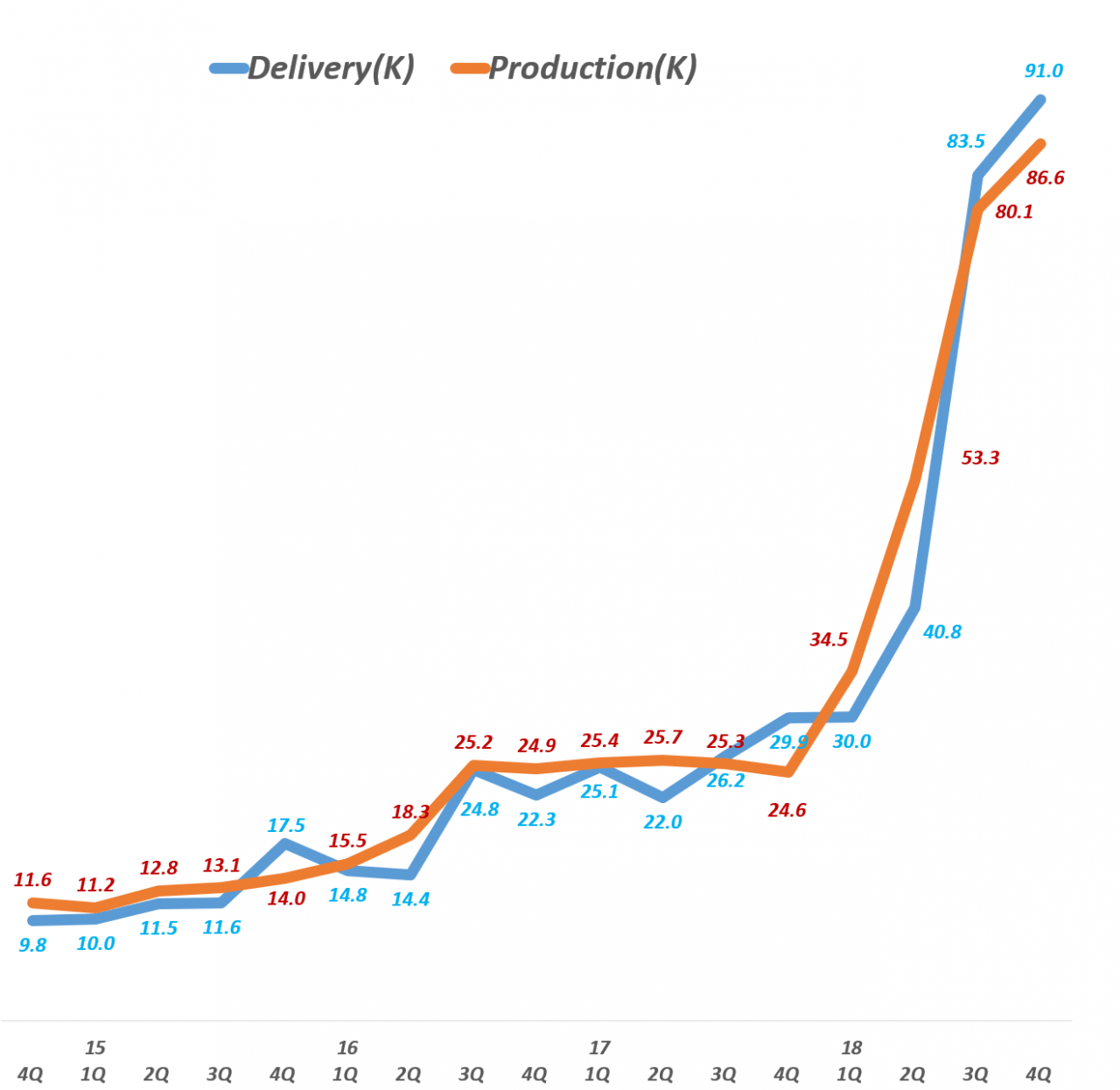 테슬라 분기별 자동차 생산량 및 자동차 배송량 추이 Tesla production & delivery(~Q4 2018), Graph by Happist