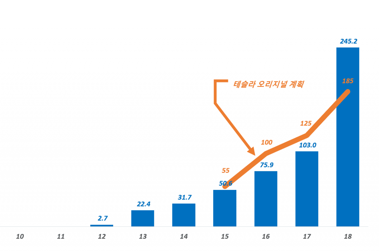 테슬라 연도별 배송량 추이와 원래 계획 비교 Tesla yearly delivery Graph by Happist