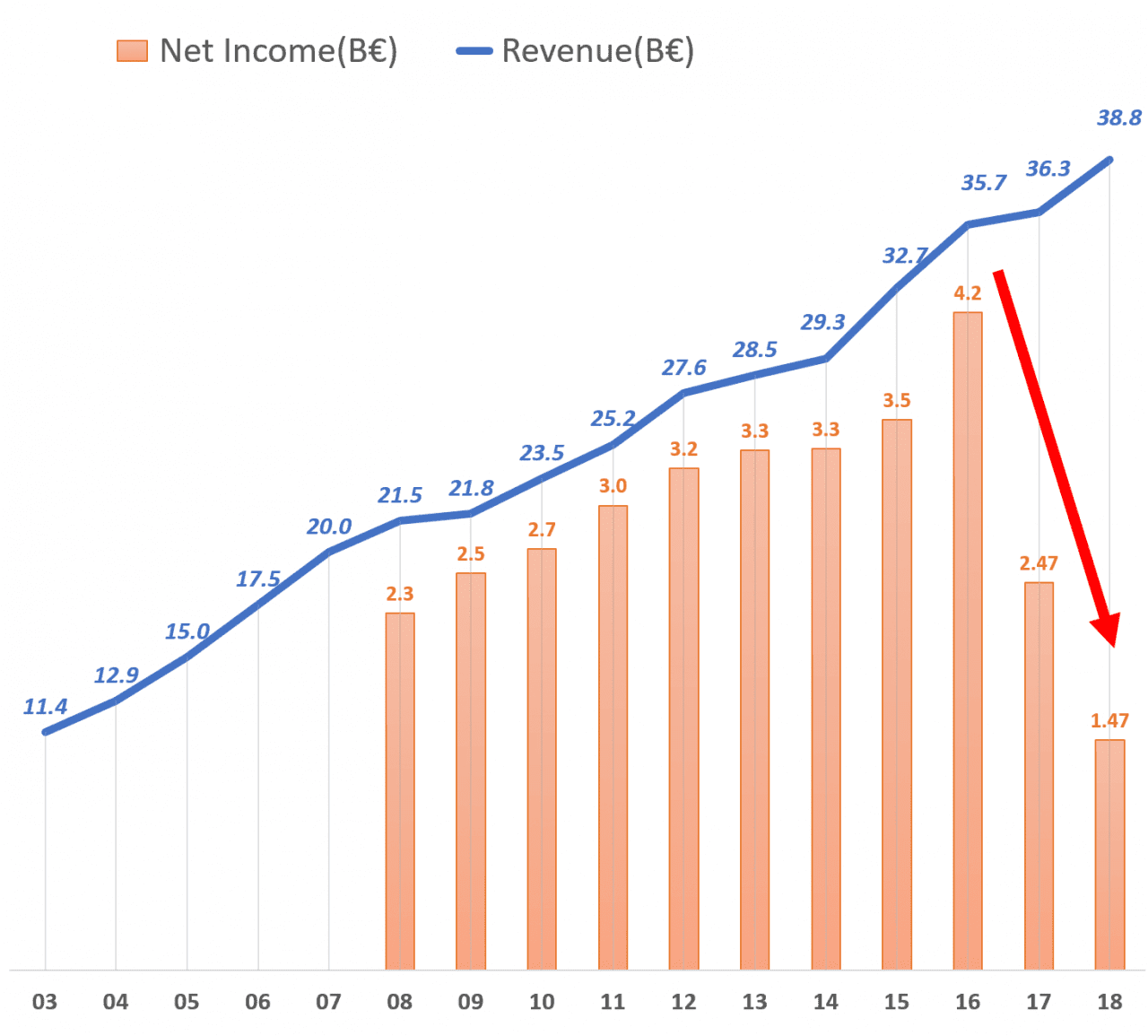 이런 막대한 투자 여파 그리고 원자재 가격 상승등으로 이케아의 순이익은 매우 가파르게 떨어지고 있습니다. 2016년 순이익 42억 유로를 정점으로 2018년에는 순이익이 14.7억 유로 수준으로 급감한 것이죠.