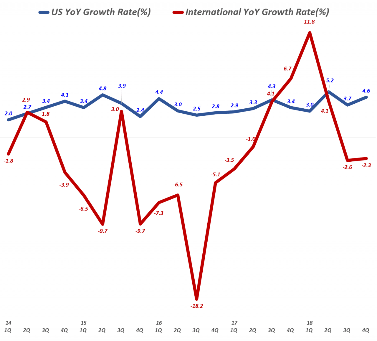 아마존 글로벌 부문 분기별 매출 및 전년 비 성장율(2014년 1분기 ~ 2018년 4분기) Amazo International revenue & y2y growth rate by quarter, Graph by Happist