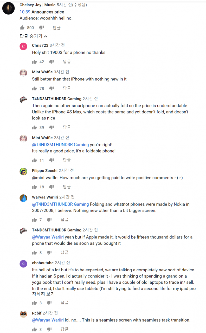 갤럭시 S10 언팩 영상 아래 댓글에는 가격에 대한 논란이 가장 많이 언급되고 있습니다. “지나치게 비싸다.” “애플이라면 훨씬 더 높은 가격을 받았을 것이니 이 정도면 선방한 것이다.” 등등