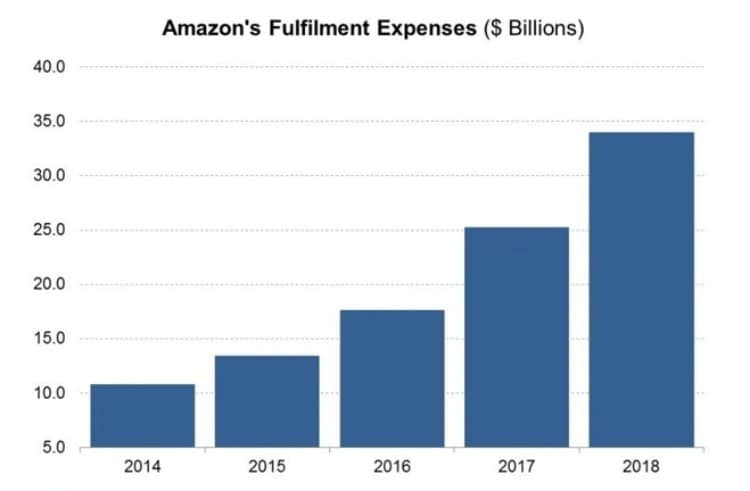 아마존이 밝힌 바에 따르면 2018년에 고객 배송비로만 전년 비 27% 상승한 277억 달러를 사용했으며, 물류 창고 등의 운영비용(Fulfilment Expenses)으로도 340억 달러를 사용해 전년 252억 달러에 비해서 88억 달러가 증가했습니다.