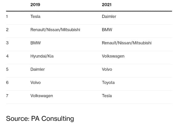 전기자동차시장 Topp 7 변화, 2019 vs 2021, Data Source – PA Consulting