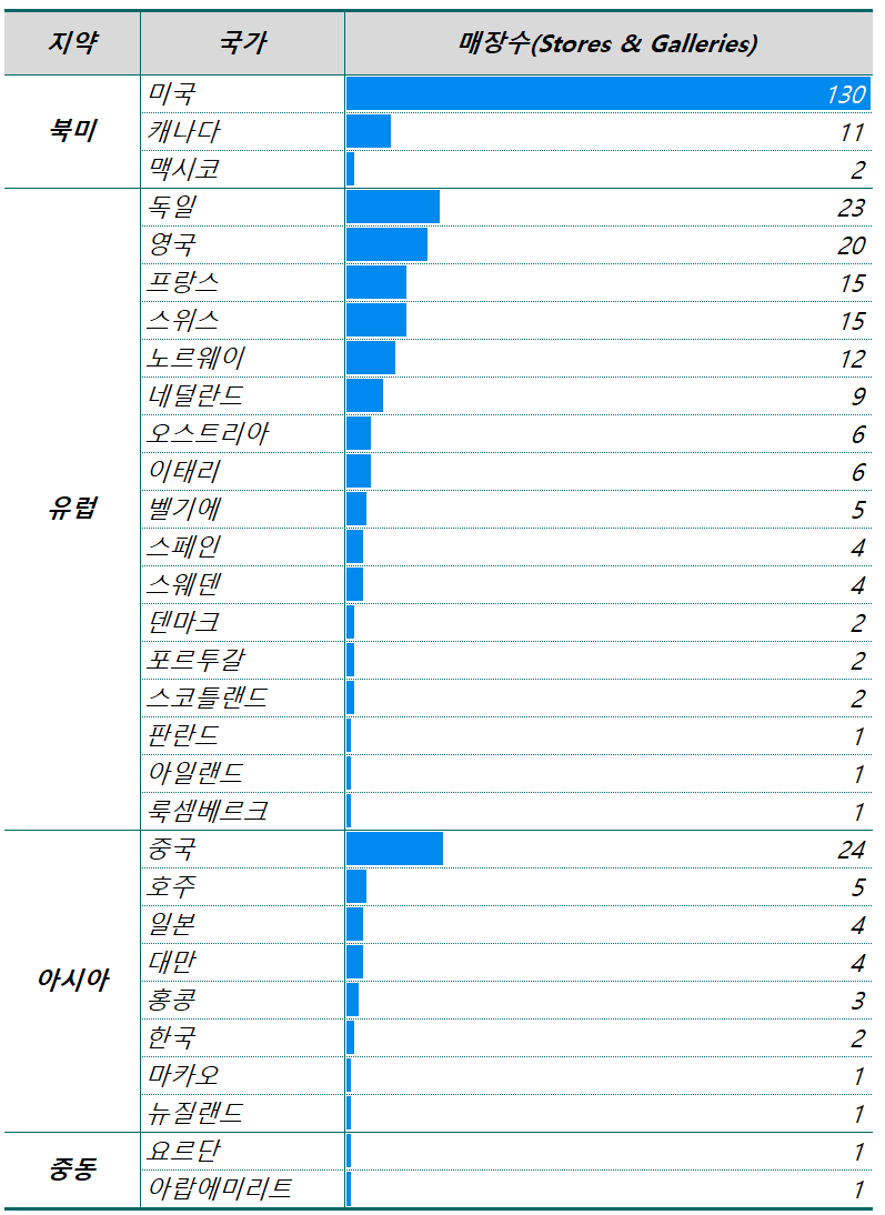 테슬라는 미국에서만 130개의 직영 판매점 및 전시장(Stores & Galleries)이 있으며, 미국에외 지역에 187개 매장이 있어 글로벌 전체로는 317개 매장을 운영하고 있습니다.