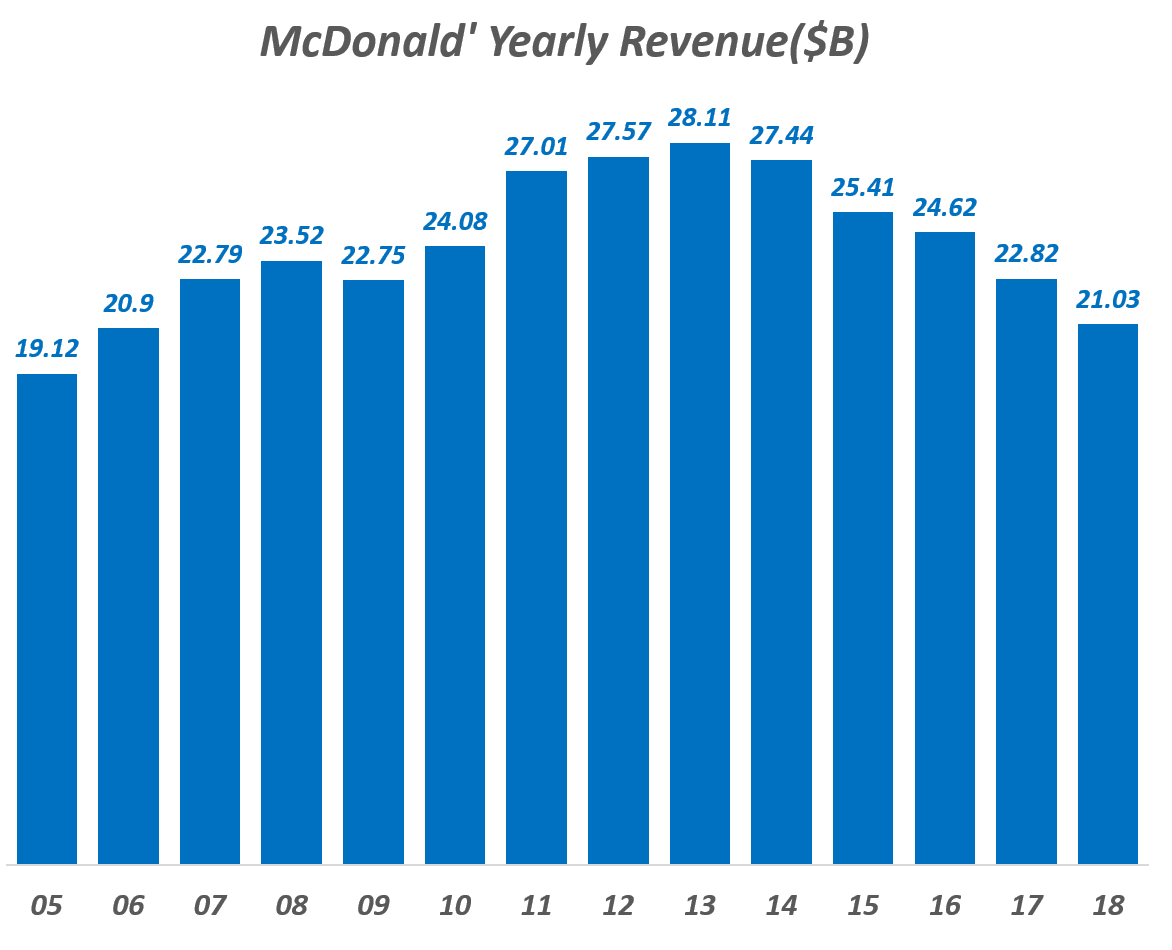 2005년부터 작년 2018년까지 매출 추이를 살펴보면 2013년281억 달러를 정점으로지속하락해 2018년엔 210억 달러로 감소했습니다. 최고 성수기에 비해서 25%이상 매출이 감소한 것이죠.