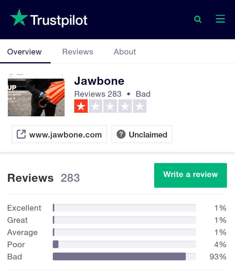 이 트러스트파일럿(Trustpilot)에는 2019년 3월 현재까지 283개의 조본 제품 사용기가 등록되어 있습니다. 이들이 평가한 조본의 평점은 Bad로 평균 평점이 0.4에 불과합니다. 아주 나쁘다는 Bad를 준 비율이 무려 93%..