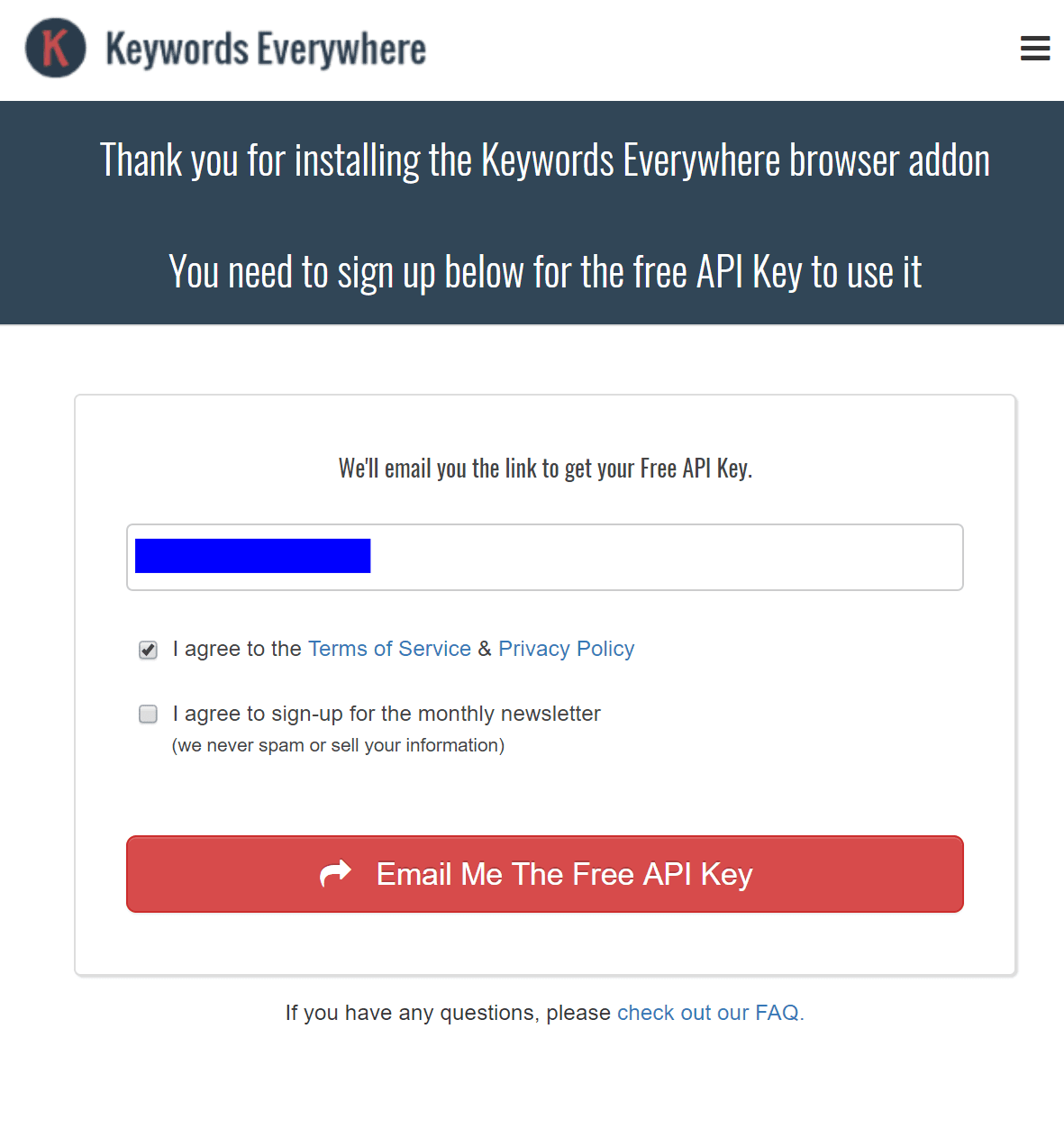 이 Keyword Everywhere를 사용하기 위해서는 API 등록을 해야 하는데요. 이는 구글에 등록된 메일로 받기를 선택해 API Code를 받아야 합니다.