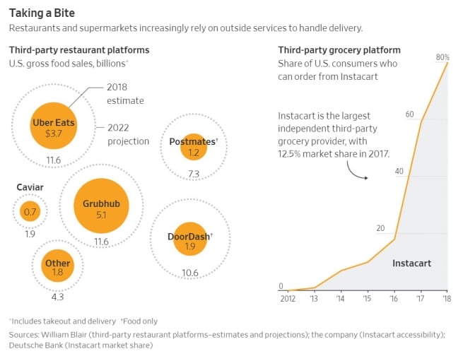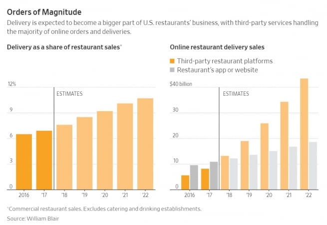 미국에서도 음식 배달업이 크게 흥하면서 주도권을 지기 위한 스타트업간의 경쟁이 치열합니다. 미국 음식 배달업 현황을 정리한 월스트리트 기사를 기반으로 참고삼아 미국 음식 배달 시장에 대해서 간단히 정리해 봅니다.