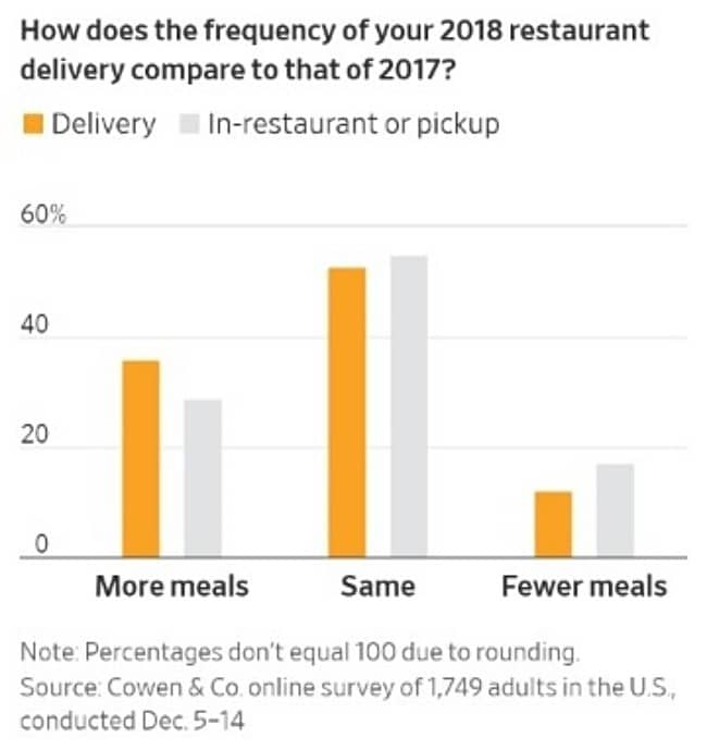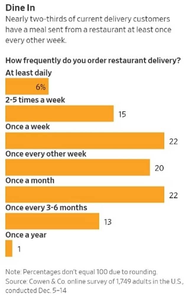 최근 코웬社가 1,750명의 소비자를 대상으로 진행한 조사 결과를 보면 매일 레스토랑 음식을 주문하는 비율은 6%에 불과 했습니다.