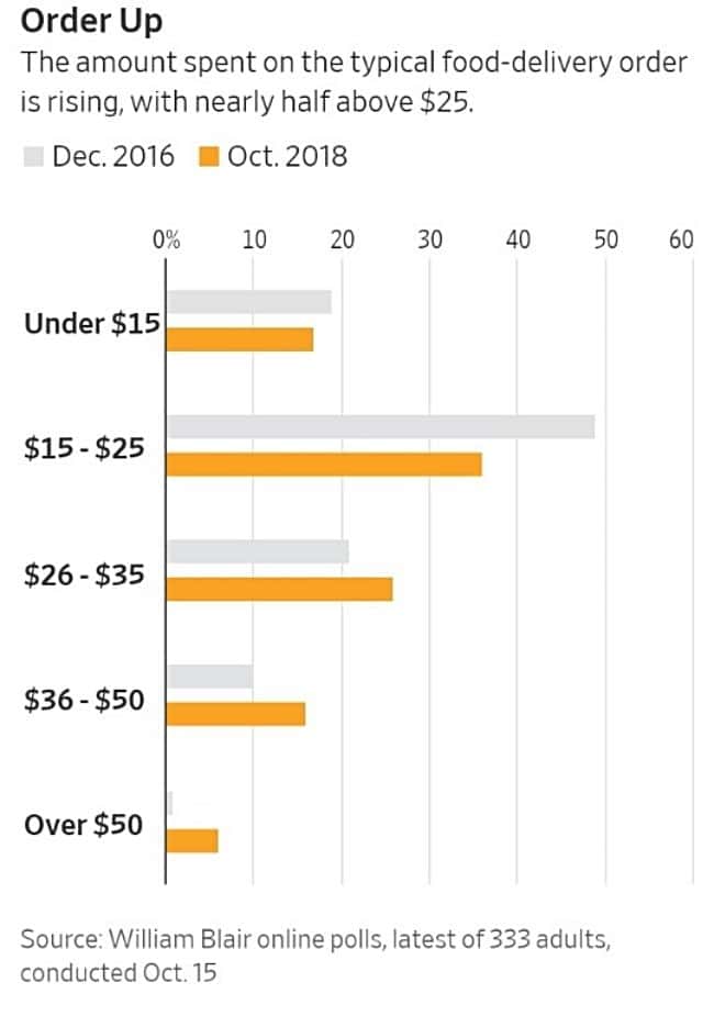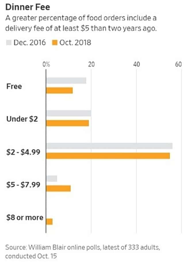 월리엄 블레어*William Blair)가 333명을 대상으로 온라인 조사 결과를 보면 배달비 무료나 5달러 이하 배달료를 받는 비율을 감소하고 5달러 이상의 배달료를 받는 비율이 높아지고 있습니다.