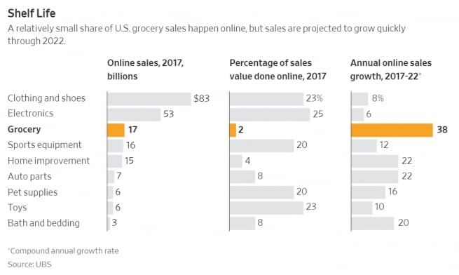 UBS Group AG 보고서에 따르면, 온라인 식료품 매출은 2017년 170억 달러에서 2022년에는 약 860억 달러로 증가할 것으로 예상했습니다. 또한 투자사인 William Blair & Co.는 음식 배달 시장 규모가 현재 250억 달러에서 2022년엔 620억 달러로 증가할 것으로 예측했습니다.