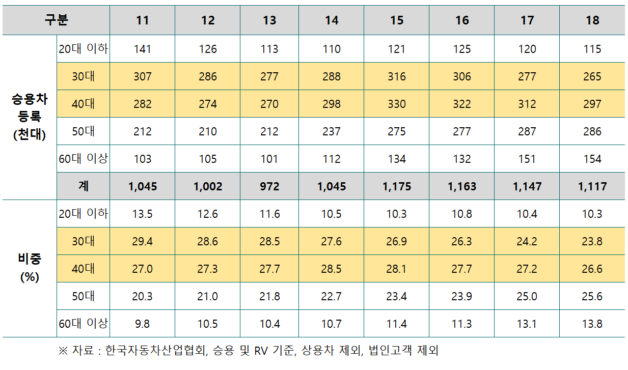 흔한 해석중의 하나가 국내 공유차 시장의 성장으로 30대와 40대가 자동차 구매가 줄고 있다고 보는 것입니다.