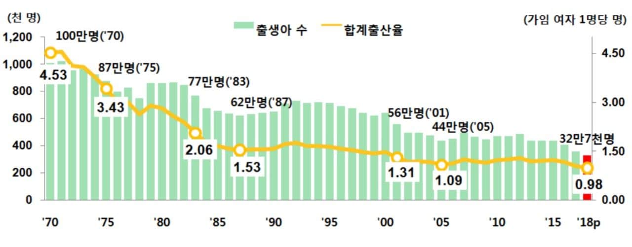 2018년 합계출생율은 관련 조사를 시작한 이래 가장 낮은 0.98을 기록했고. 이는 세계에서 가장 낮은 수준으로 알려졌습니다. 2018년에 출생아는 32만 6900명으로 10년전에 비해 27%나 줄었습니다.
