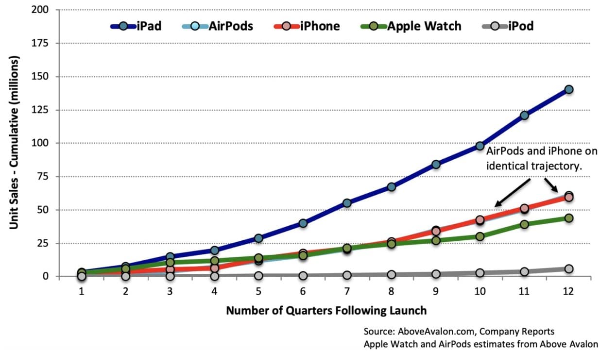 애플 제품을 출시 후 일정 기간동안 판매 추이를 비교해보면 어떤 함의를 찾을 수 있다. 아래 그래프에서 보여주듯이 에어팟 판매량은 아이폰 판매량과 비슷한 추이를 보인다.